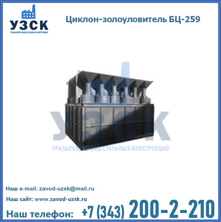 Если вы планируете купить то или иное оборудование, например, циклоны-золоуловители БЦ-259, то рекомендуем заказать данный товар на сайте УЗСК. Мы производим и реализуем продукцию высокого качества по приемлемой цене. Эксперты Уральского Завода Стальных Конструкций в Братске проконсультируют вас по всем вопросам, помогут сделать выбор и оформить заказ без лишних временных затрат. Мы гарантируем соответствие нашей продукции всем требованиям ГОСТ и ТУ, а также износостойкость и высокую производительность предлагаемого оборудования. Если требуется изготовить циклон нестандартных размеров, то такой вариант выполнения заказа тоже предусмотрен, так как предприятие имеет собственные производственные площади и надежных поставщиков. На все поставляемое или производимое оборудование имеются чертежи и прочая техническая документация. Заказать и купить циклоны или прочее оборудование высокого качества и по доступной цене можно через наш сайт или по указанному в разделе «Контакты» телефону.