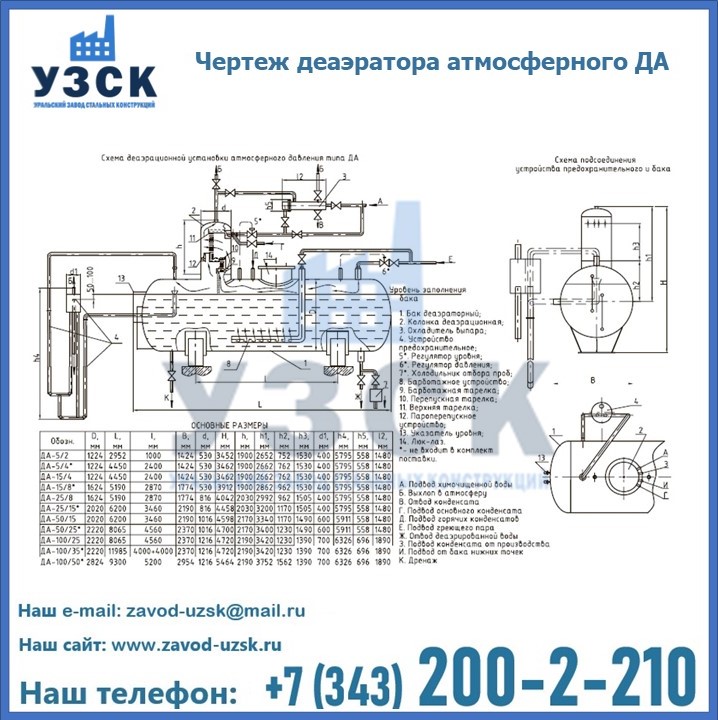 Приобрести качественное оборудование, в том числе, деаэраторы ДА, можно в компании УЗСК в Братске. Мы предлагаем долговечную и надежную продукцию по приемлемой цене. Заказать и купить деаэраторы или другие изделия высокого качества можно через сайт Уральского Завода Стальных Конструкций, или позвонив по указанному в разделе «Контакты» телефону.